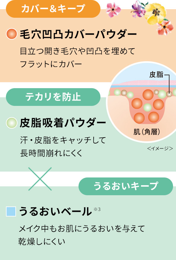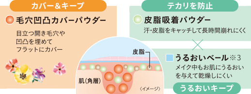 毛穴凹凸カバーパウダーで、開き毛穴や凹凸をフラットにカバー。テカリ防止+保湿ケアで毛穴落ちを防ぎ、毛穴レス※1肌を長時間メイクキープ!