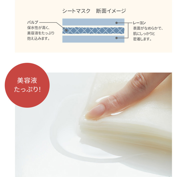 美容液の保水力にこだわり、レーヨン100%ではなくパルプを挟んでいます。美容液の保水力にこだわったシートです。繊細なつくりのため、破れないよう丁寧に取り出しご使用ください。