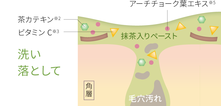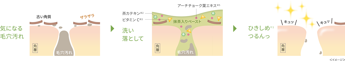 キメの整ったつるり肌へ宇治抹茶を含んだペーストが、毛穴汚れを洗い落として、お肌ひきしめ※1キメの整ったつるり肌に導きます。