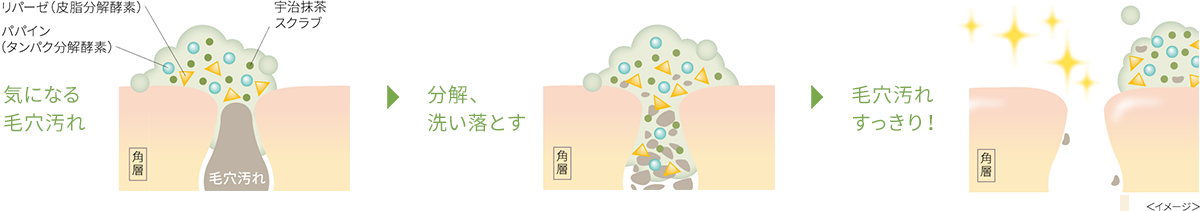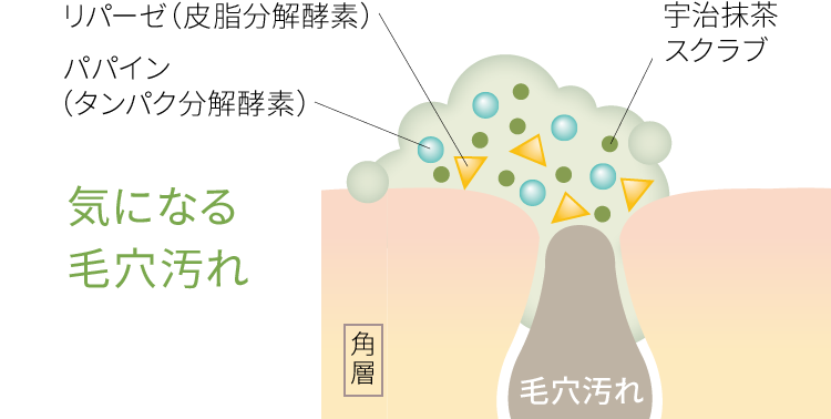 で毛穴汚れすっきり!毛穴に詰まった皮脂汚れを2つの酵素で分解し、宇治抹茶の微細スクラブで黒ずみなどの毛穴汚れを洗い落とします。