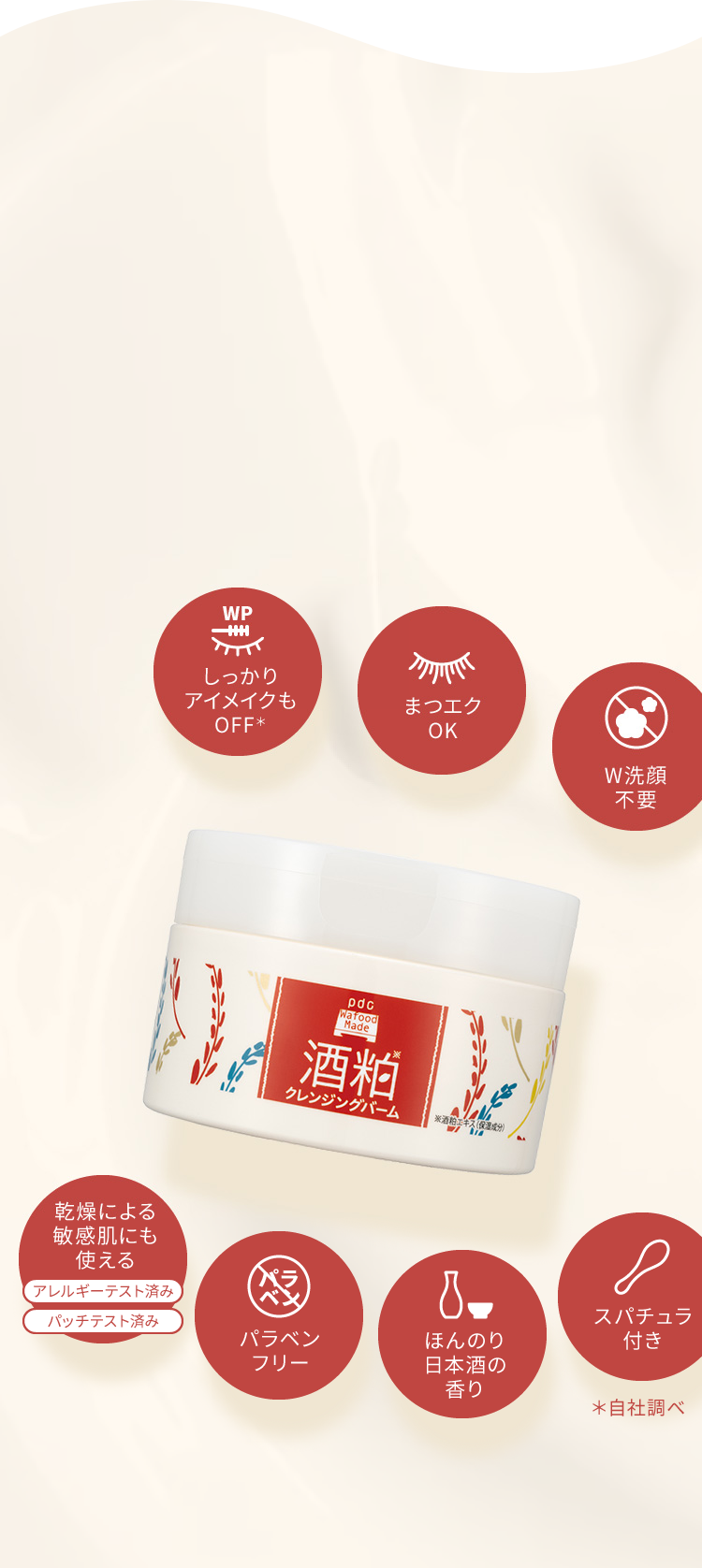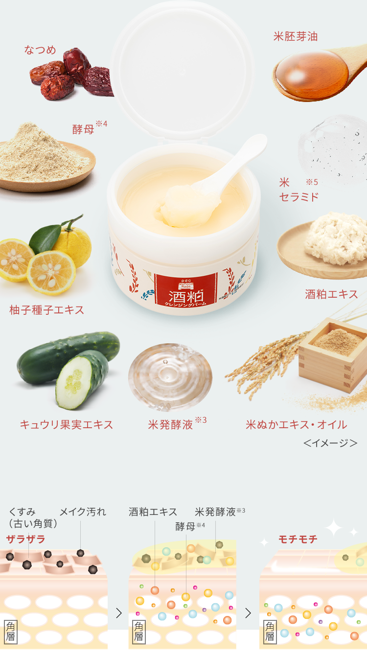 酒粕クレンジングバーム成分名 配合目的 パルミチン酸エチルヘキシル エモリエント成分 リンゴ酸ジイソステアリル エモリエント成分 ミネラルオイル エモリエント成分 トリイソステアリン酸PEG-20グリセリル 洗浄成分 イソステアリン酸PEG-6 洗浄成分 水添ポリイソブテン エモリエント成分 ポリエチレン 増粘剤 合成ワックス 増粘剤 酒粕エキス 保湿成分 コメ発酵液 保湿成分 加水分解酵母エキス 保湿成分 コメヌカ油 エモリエント成分 コメ胚芽油 エモリエント成分 コメヌカエキス 保湿成分 キュウリ果実エキス 保湿成分 コメヌカスフィンゴ糖脂質 保湿成分 ユズ種子エキス 保湿成分 ツルレイシ果実エキス 保湿成分 ナツメ果実エキス 保湿成分 エチルヘキシルグリセリン 保湿成分 プロパンジオール 保湿成分 BG 保湿成分 水 基剤 トリエトキシカプリリルシラン 感触改良剤 マイクロクリスタリンワックス 増粘剤 酸化鉄 着色剤 フェノキシエタノール 防腐剤 香料 香料