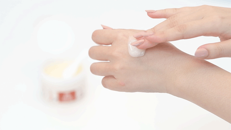 手肌が乾いた状態で適量(付属のスパチュラ山盛り1杯)を手に取り、メイクになじませます。