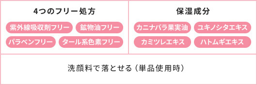 ●不含4种配方・・・不含紫外线吸收剂、不含矿物油、不含对羟基苯甲酸酯、不含焦油类色素